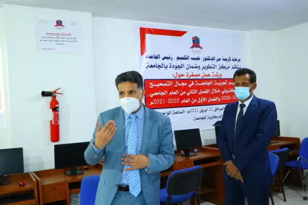 نظم مركز التطوير وضمان الجودة بالجامعة اليوم الخميس ورشة عمل لتقييم تجربة الإختبارات والتصحيح الالكتروني بالجامعة " للفصل الدراسي الأول من العام الجامعي 2019-2020 والفصل الدراسي الثاني من العام الجامعي 2020-2021م".